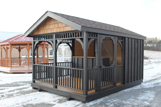SV Structures specializes in gazebos, pavilions, and more! You have the option to chose your colors, bracing, spindles, and roof. Additional features such as screens, electrical packages, and benches can be added. Reach out to a Catskill Shed Company Rep to get you a price today! Info@catskillsheds.com or 607-320-5005