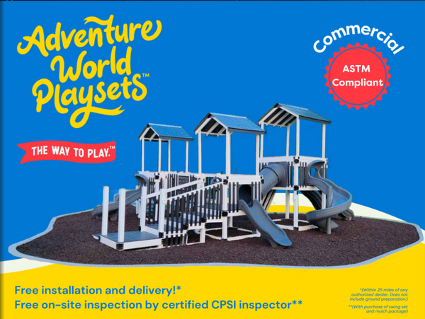 Adventure World Play Sets are made in the USA and constructed with the highest standards. The following quality and safety features are included at no extra cost on all of our swing sets. Save money over time by not having to repaint or restain your kids playsets. Vinyl sleeving protects against water and moisture preventing cracking and rotting.