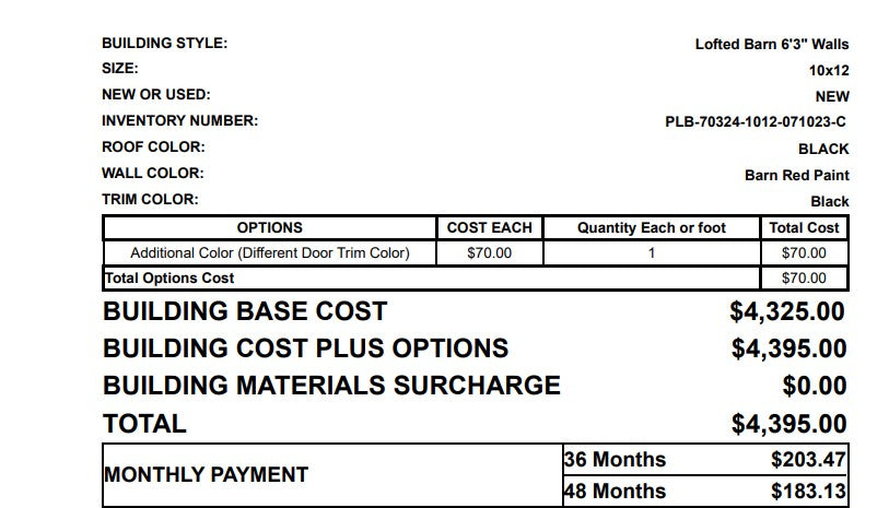 12x16 lofted barn painted red with black trim and a black metal roof. This one comes with the following options: