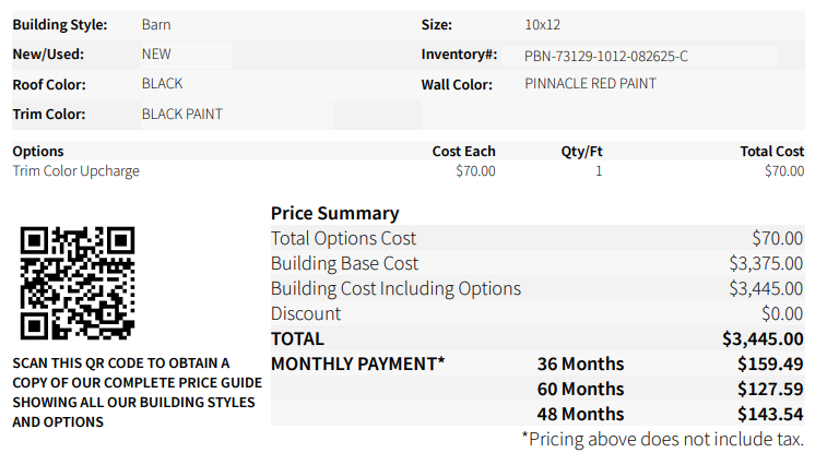 10x12 Mini barn painted red with white trim and a black metal roof. This one comes with the following options: