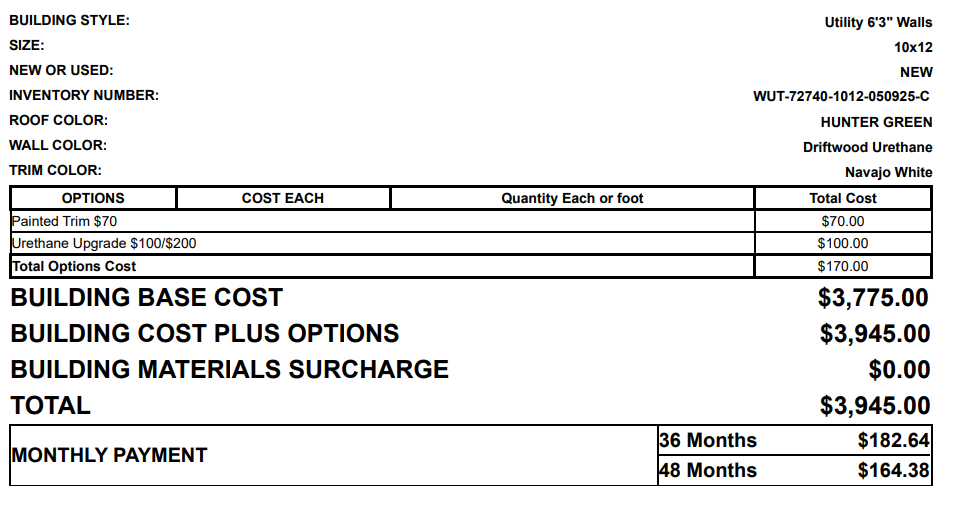 10x12 Utility shed painted driftwood with navajo white trim and a green metal roof. This one comes with the following options: