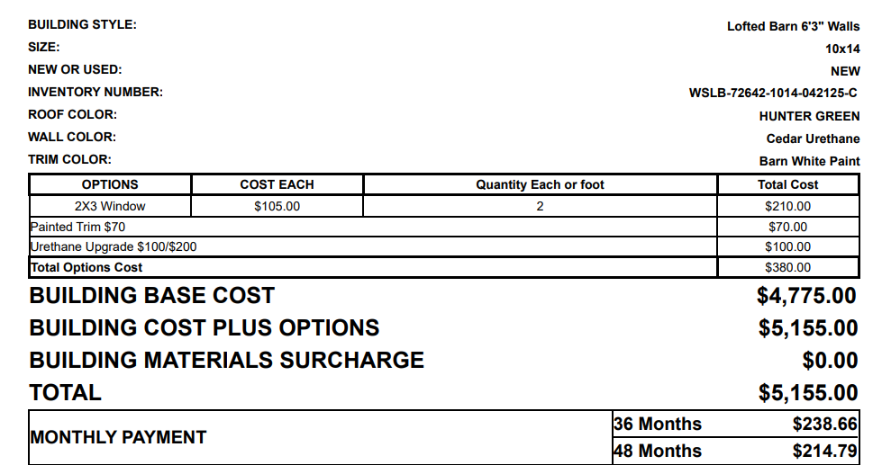 10x14 side lofted barn painted cedar with white trim and a green metal roof. This one comes with the following options: