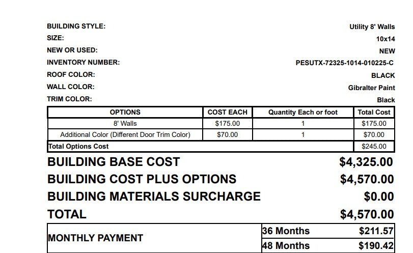 10x14 side utility shed painted Gibraltar with black trim and a black metal roof. This one is an economy style saving you $100! Gable vents, 8ft tall wall upgrade, and standard 6ft double barn doors included.