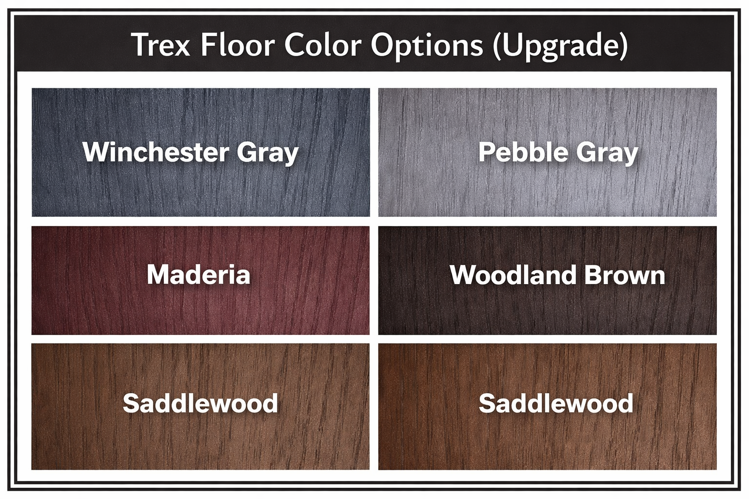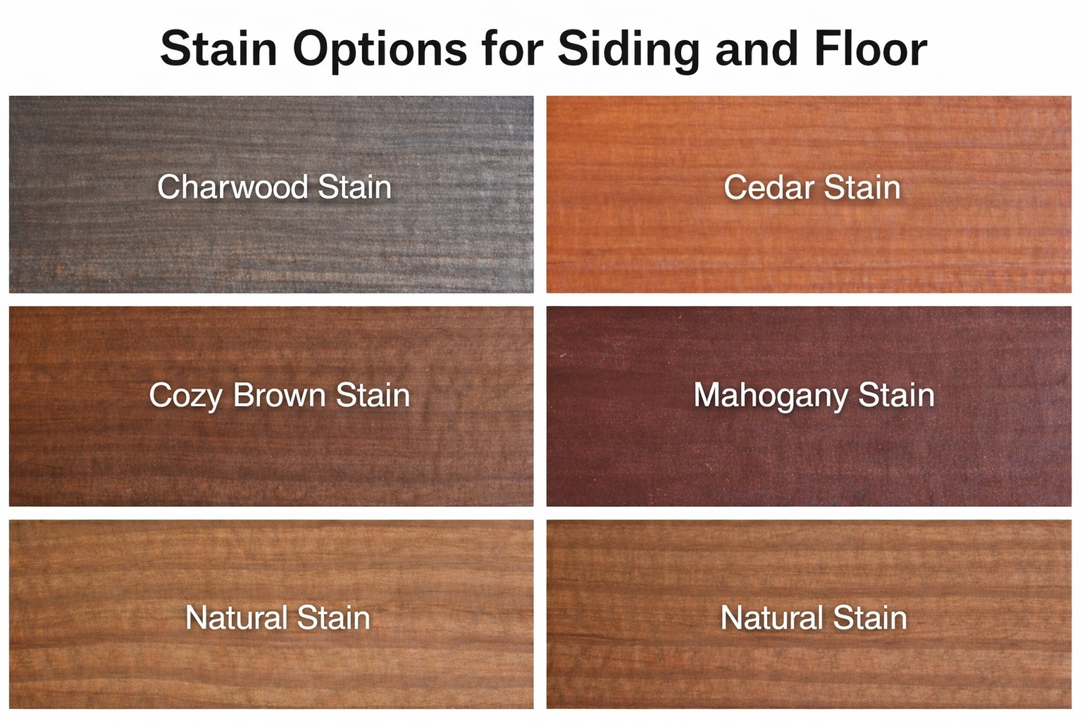 SEE PHOTOS FOR STAIN/ROOF COLOR OPTIONS (standard price includes shingles and stained siding, floors)