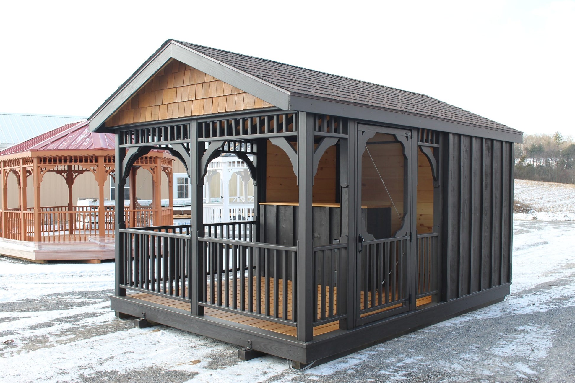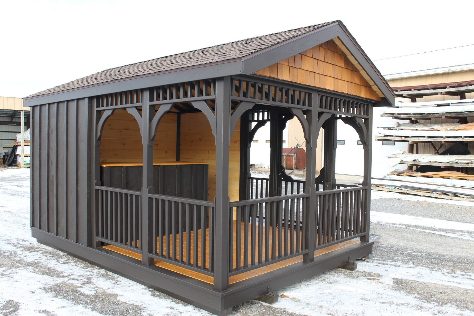 10x14 Gazebo with board and batten walls + BAR! Built and delivered in 8-10 weeks after payment and paperwork have been received. A sales rep will be in contact shortly after placing order to confirm details or feel free to contact us first by phone call, message, or stopping in to see us