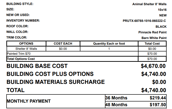10x16 animal shelter painted red with white trim and a black metal roof. This one comes with the following options: