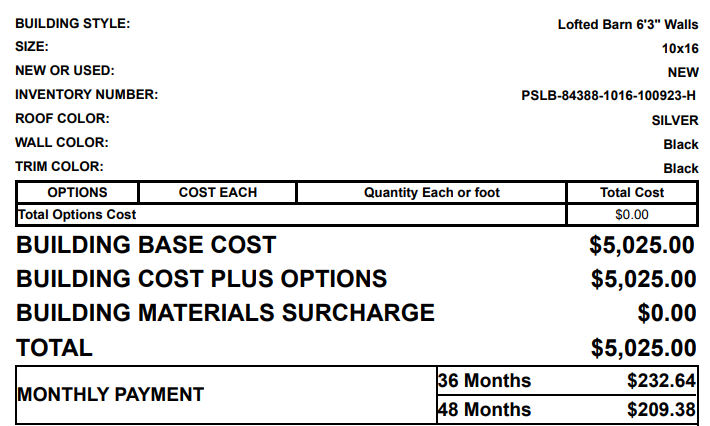 Side lofted barn painted black with a galvalume metal roof. This one comes with the following options: