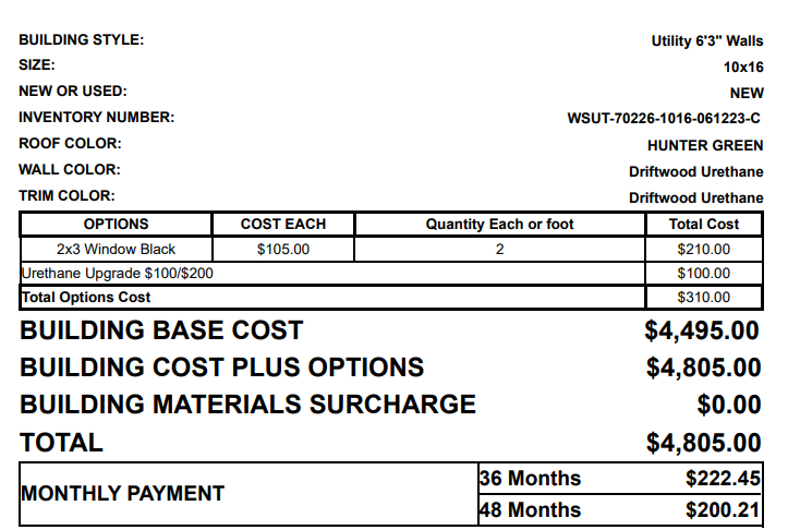 10x16 side utility shed painted driftwood with a green metal roof. This one comes with the following options: