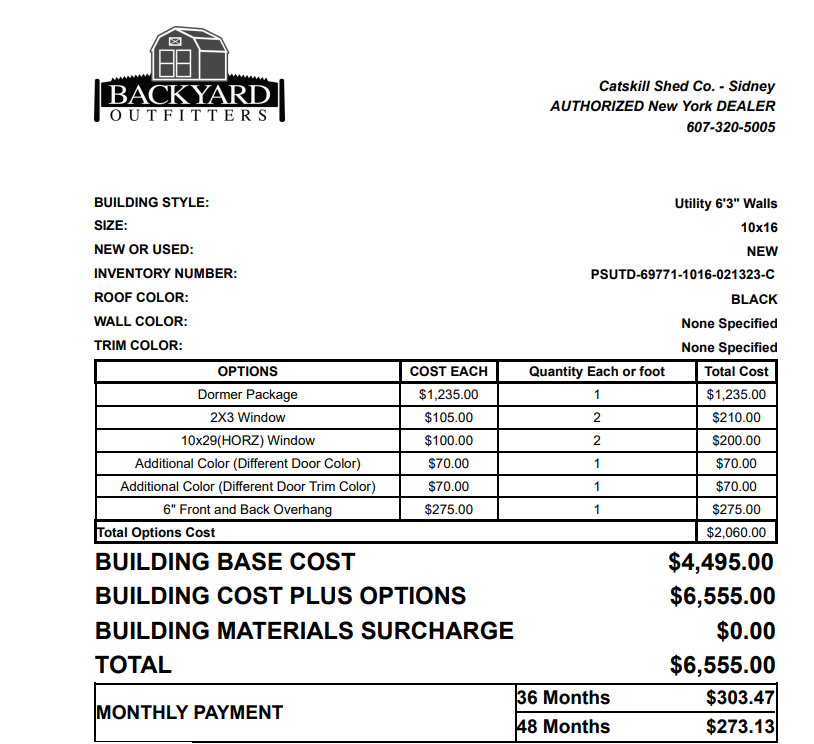 10x16 Utility dormer painted gap gray with barn white trim, cedar door, and a black metal roof. This one comes with the following options:
