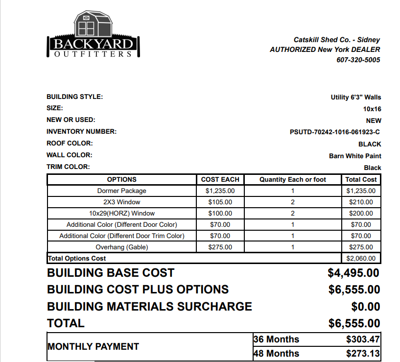 10x16 Utility dormer painted white with a cedar door, black trim, and black metal roof. This one comes with the following options: