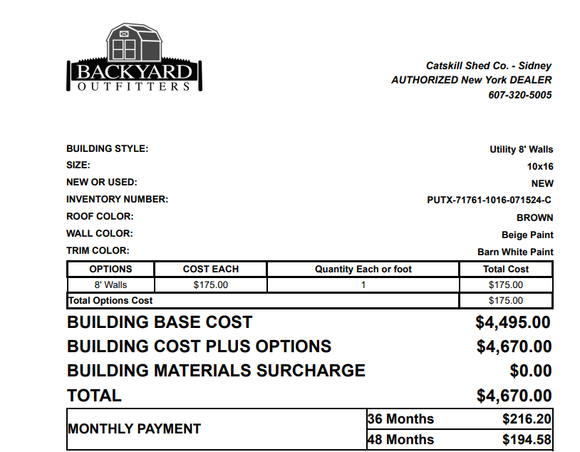 10x16 utility shed painted beige with white trim and a 29 gauge brown metal roof. This one comes with an 8ft tall wall upgrade, 6ft double barn doors, gable vents, and a 5 year manufactured warranty.