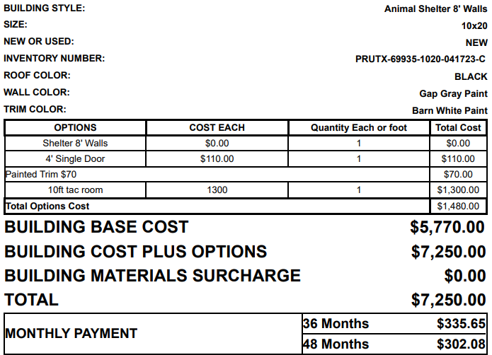 10x20 animal shelter painted gray with white trim and a black metal roof. This one comes with the following options: