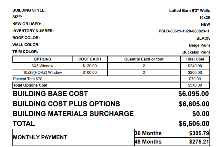 10x20 side lofted barn painted Navajo with buckskin trim, and a brown shingled roof. This comes with (2) 3x3 windows and a set of double barn doors with transoms on the 20 ft side. 5 year manufactured warranty and gable vents included in purchase price.