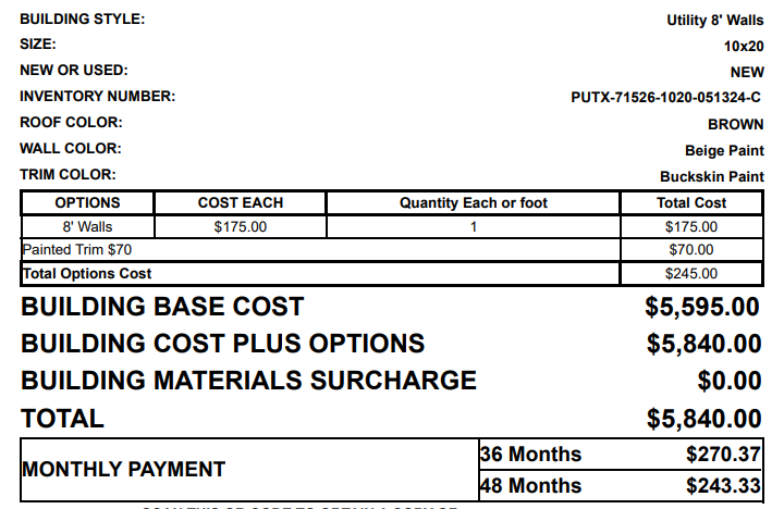 10x20 utility shed painted beige with buckskin trim and a brown metal roof! This one comes with the following options: