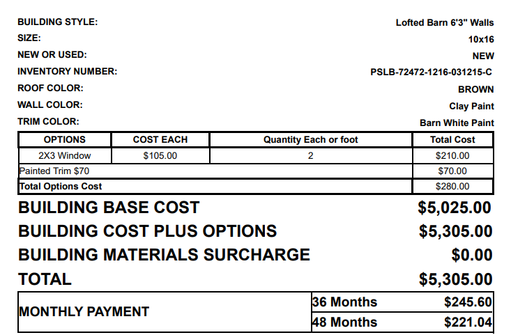12x16 lofted barn painted red with white trim and a black metal roof. This one comes with the following options: