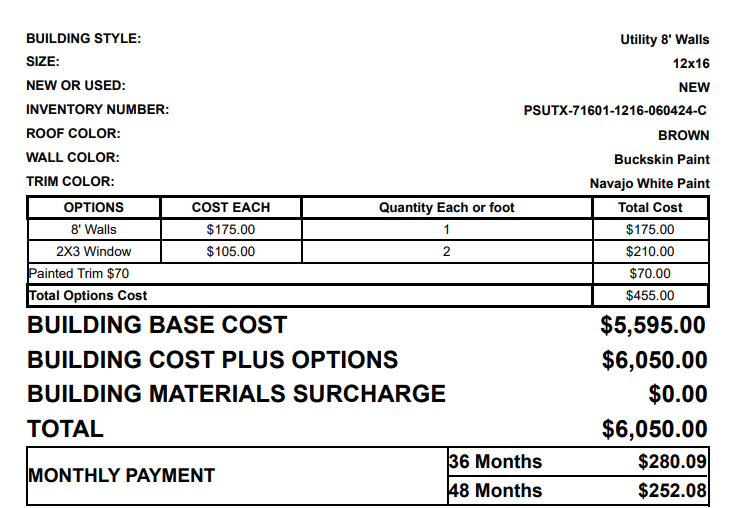 12x16 side utility shed painted buckskin with navajo trim and a brown metal roof. This ones comes the following options: