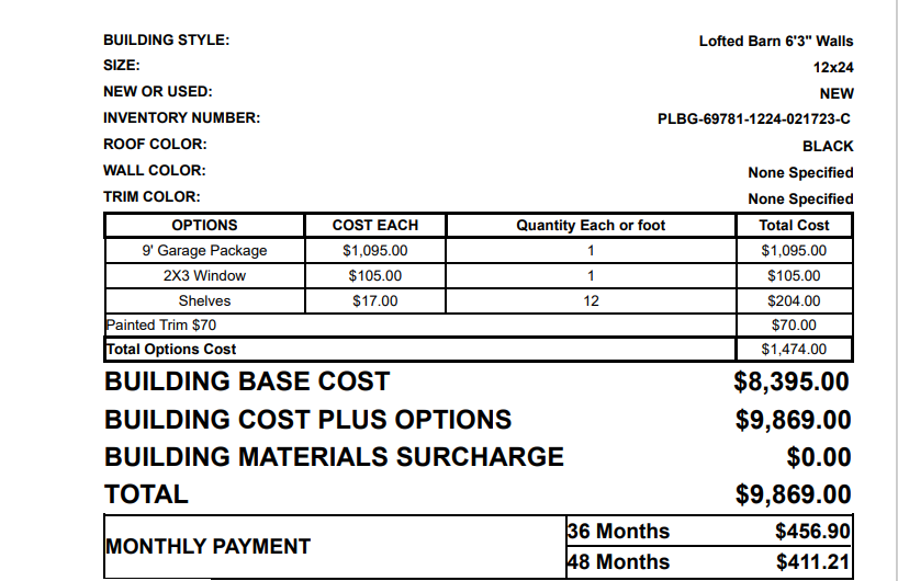 12x24 lofted barn garage painted white with black trim and black metal roof. This one has a 9x7 rollup door, 2x3 window, 36" man door, shelving, gable vents, and a 5-year manufactured warranty.