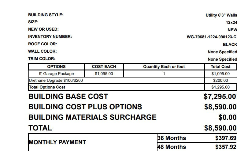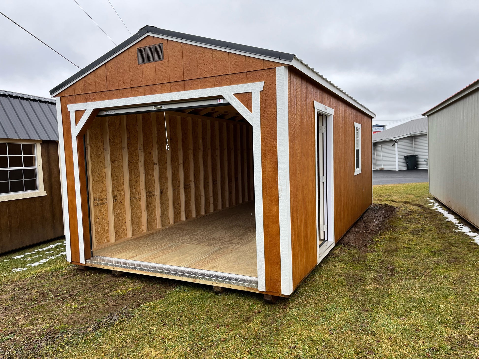 12x24 utility garage with cedar siding, white trim, and a green metal roof. This one comes with the following options: