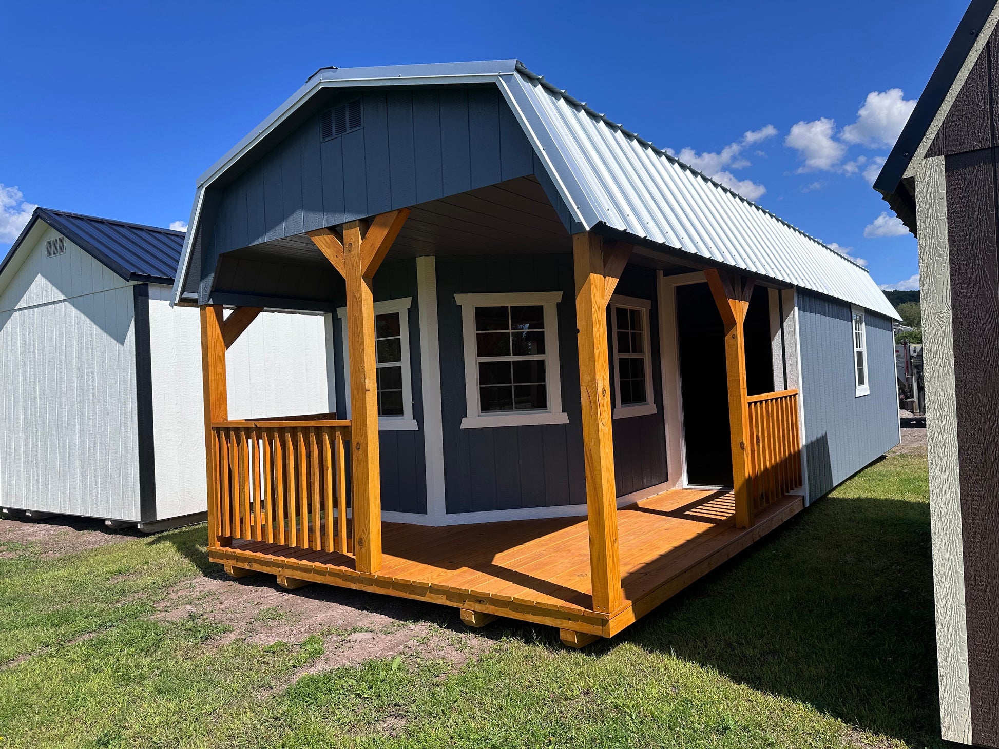 12x32 lofted barn with our deluxe cabin package. This one is painted gibraltar with white trim and a galvalume metal roof. Options included: