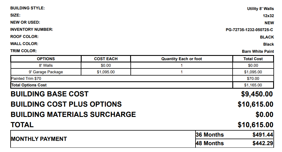 12x32 Utility garage painted red with white trim and a black metal roof. This one comes with the following options: