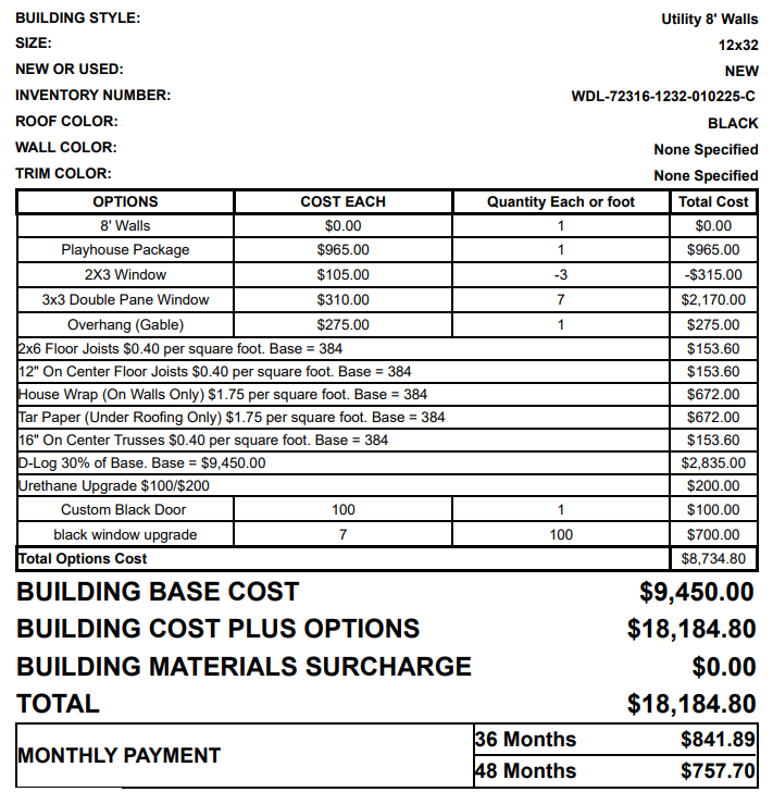12x32 log sided cabin with driftwood urethane stain and a black metal roof! This one comes with many upgraded features including the 4ft porch, (7) 3x3 double pane windows (black,) (1) 36" tall 9-lite entry door (black,) 2x6 walls, floors, and rafters, 12inch on center floor joists, 16" on center rafters, house wrap (walls only,) tar paper (roof only,) 6" overhangs front and back gable end, and a 5 year manufactured warranty!