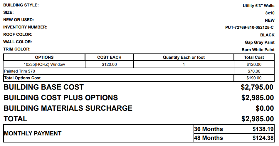 8x10 Utility Shed painted gray with white trim and a black metal roof. This one comes with the following options:
