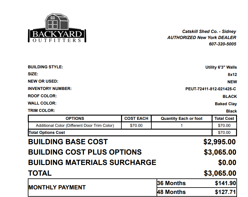 8x12 economy shed painted clay with black trim and a black metal roof. This one comes with a single 4ft barn door on the gable end with 6'3" wall height and gable vents!
