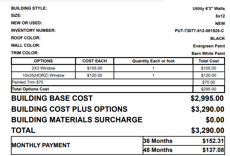 8x12 utility shed painted evergreen with white trim and a black metal roof. This one comes with the following options: