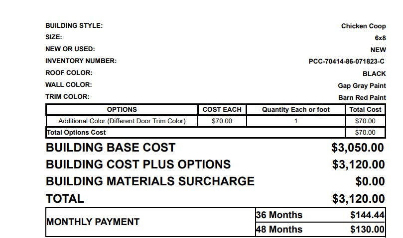 8x6 Chicken Coop painted gray with red trim and a black metal roof. This one comes with the following options: