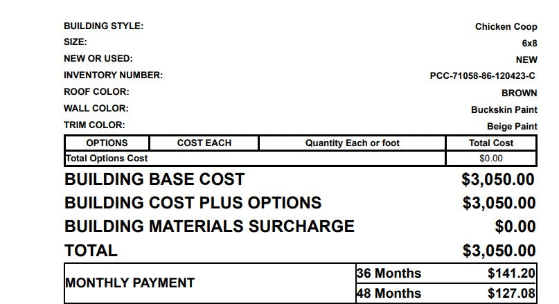 8x6 coop painted buckskin with beige trim and a 29 gauge brown metal roof. This comes with (5) nesting boxes, roosting bars, (2) windows, coop door, and separate walk in entry door for easy access!