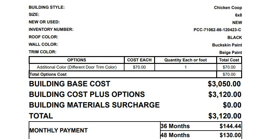 8x6 Chicken Coop painted cream with beige trim and a black metal roof. This one comes with the following options: