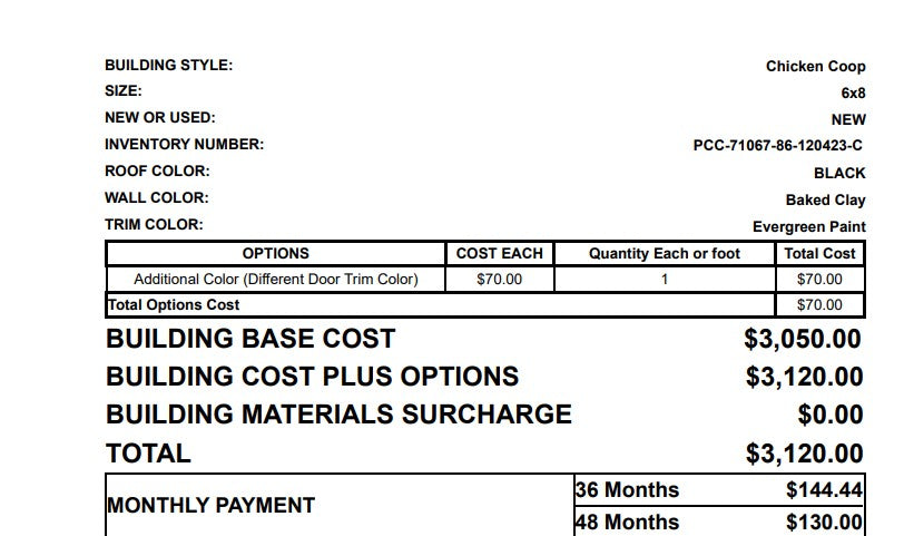 8x6 chicken coop painted clay with green trim and a 29 gauge black metal roof. This comes with (5) nesting boxes, roosting bars, coop door, and a separate entry door for easy access!