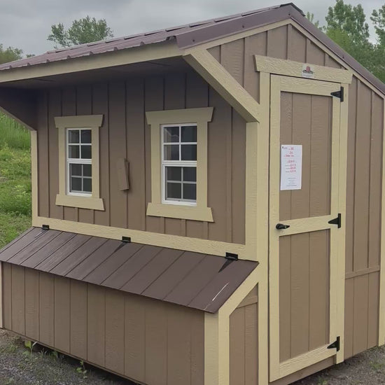 8x6 Chicken coop as pictured. This one comes with (5) nesting boxes, roosting barns, entry door, coop door with ladder, and (2) windows.