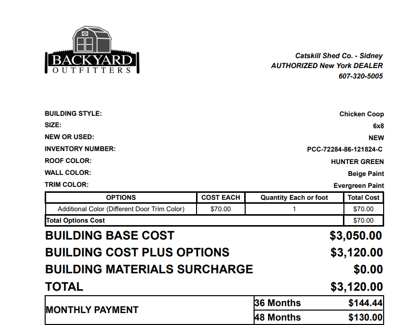 8x6 Chicken Coop painted cream with green trim and green metal roof. This one comes with the following options: