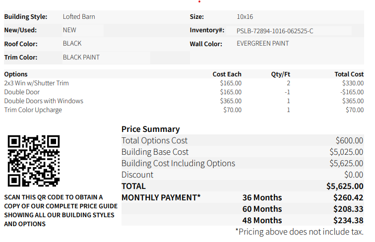 Side-Lofted barn painted evergreen with black trim and a black metal roof. This one comes with the following options: